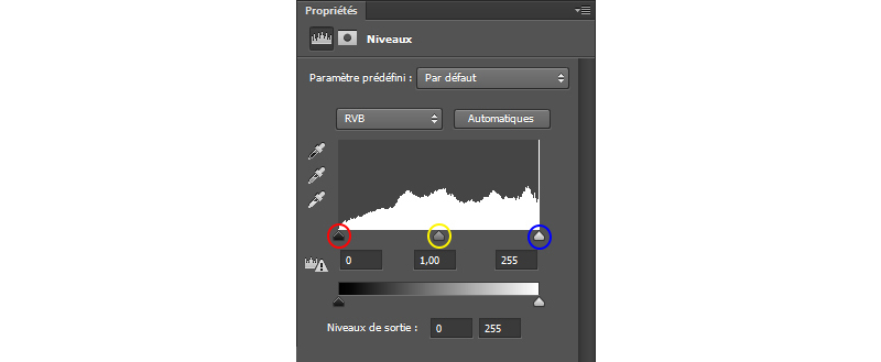 Le réglage des niveaux présente 3 curseurs. Un placé à gauche, un central et un à droite. Chacun de ces curseurs agit sur un ton précis. Si vous avez bien compris l’histogramme, cela va être facile à comprendre.